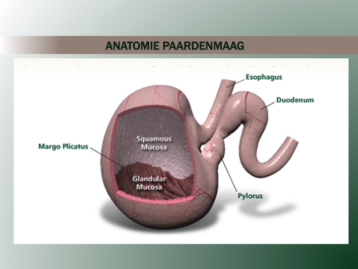 Bij het paard is de maag verdeeld in twee afzonderlijke gebieden met elk hun eigen ‘bekleding’ (epitheel). Het bovenste witte gebied is bekleed met een slijmvlieslaag (de epitheliale mucosa) en het onderste gebied is bekleed met kliercellen (de glandulaire mucosa).