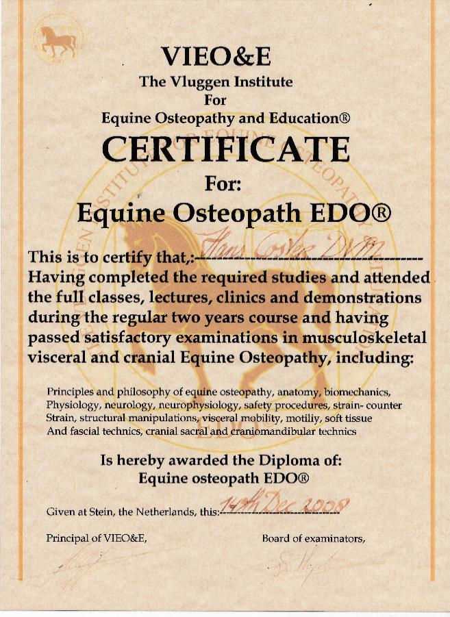 Hans was een van de eerste paardenartsen die paardenosteopaat werd. Hij rondde deze volledige opleiding voor paardenosteopathie af met een tien. Dat komt niet alleen doordat hij de materie ontzettend interessant vindt (alles in het lichaam werkt interactief!) maar zeker ook omdat hij van nature een handige "doener" is.